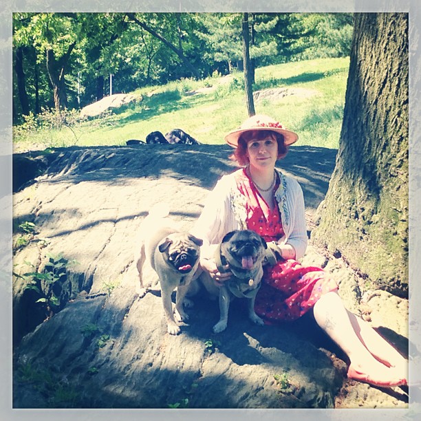 I love that while the two women pick their fruit their dog waits patiently, below maybe hoping for a taste.